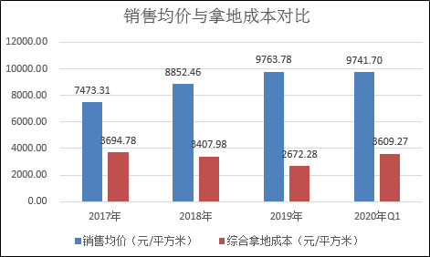 2020年第一季度,金科拿地302万平方米,继续超过同期271万平方米的销售面积。不过值得一提的是,相较此前,2020年一季度公司的拿地成本大幅上升。2020年Q1公司的新增土地储备成本为3609.27元/平方米,较2019年的2672.28元/平方米上升35.06%,而一季度的销售均价却较此前有所下滑。