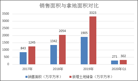 而进行跨越发展、甚至实现弯道超车的第一步便是拿地,金科股份近几年维持积极的土地投资策略。数据显示,近几年公司的新增土地储备面积持续大于销售面积,土储池子持续扩大,截至2019年末,公司总可售面积约6700万平方米,约是当年销售面积的3.52倍。