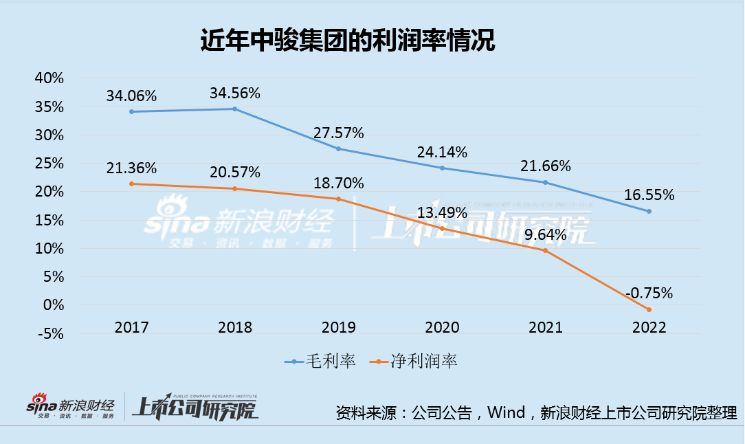 实际上,由于交房面积减少及平均销售单价下降,2022年中骏集团仅实现营业收入267.05亿元,同比下滑29%。且仅录得毛利润为44.2亿元,Wind数据显示,即使囊括物业及租金收入等业务,中骏的整体毛利率也只有16.55%,净利润(含归母利润及少数股东损益)的更是绿的亏损,净利润仅有-0.75%。