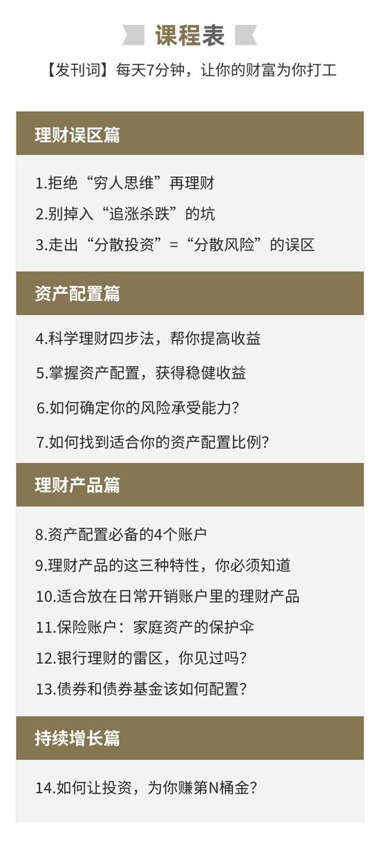 5大主题,15堂课,每天7分钟,升级你对金钱和财富的认知概念,重构你对理财和投资的底层逻辑。从零开始,1个月掌握科学理财法,了解四大账户,掌握最优资产配置方法,助你真正做到理财有道。