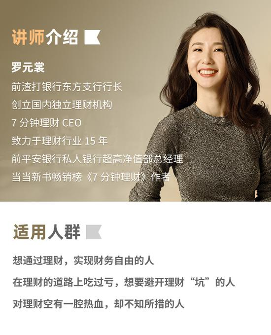 新浪理财大学音频课《7分钟理财课》,罗元裳老师教你管理自己的财产,每天7分钟,持续性地提高你对财富状况的敏感度和对生活的规划能力,让你既能挣到更多钱、还能存下更多钱!