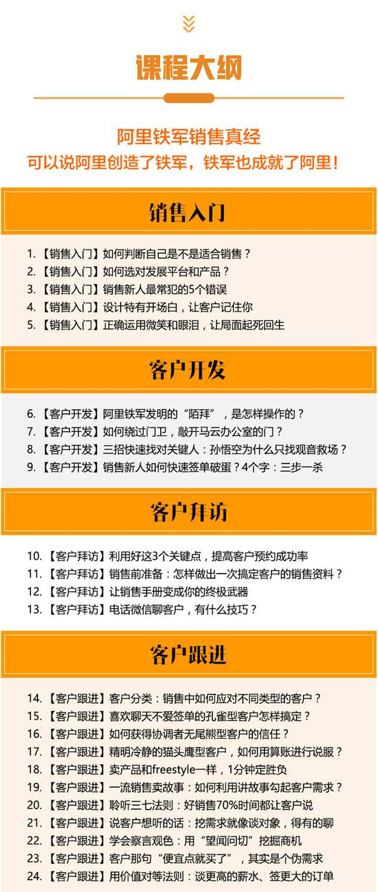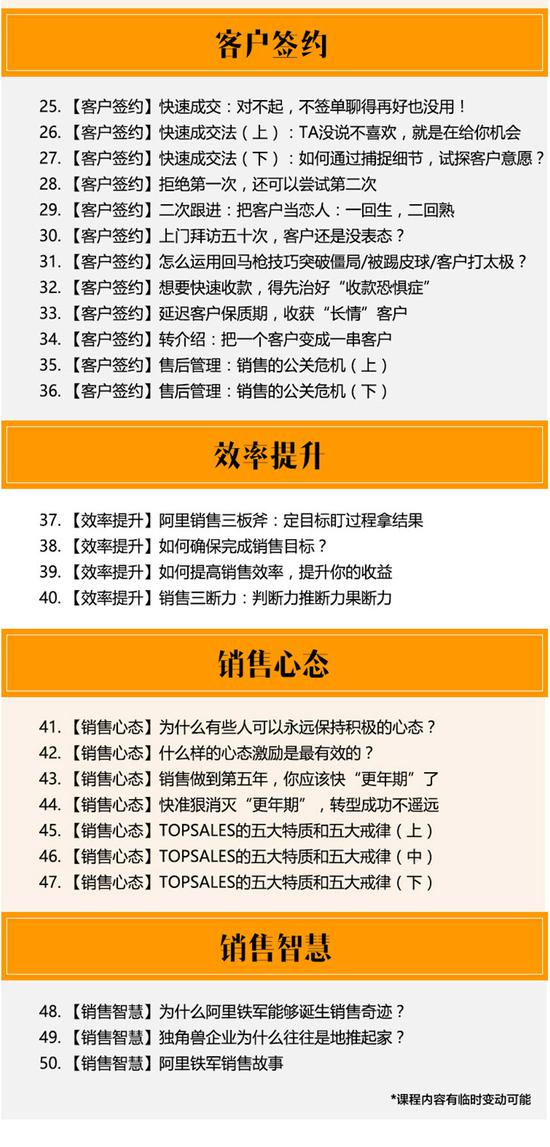 9大模块,层层递进,系统化学习,把握销售过程中的每一个环节;50节课程,每一节都讲一个具体的销售技巧;从入门到进阶,从理论到实战,从行动到心态,涵盖销售过程的每一方面!