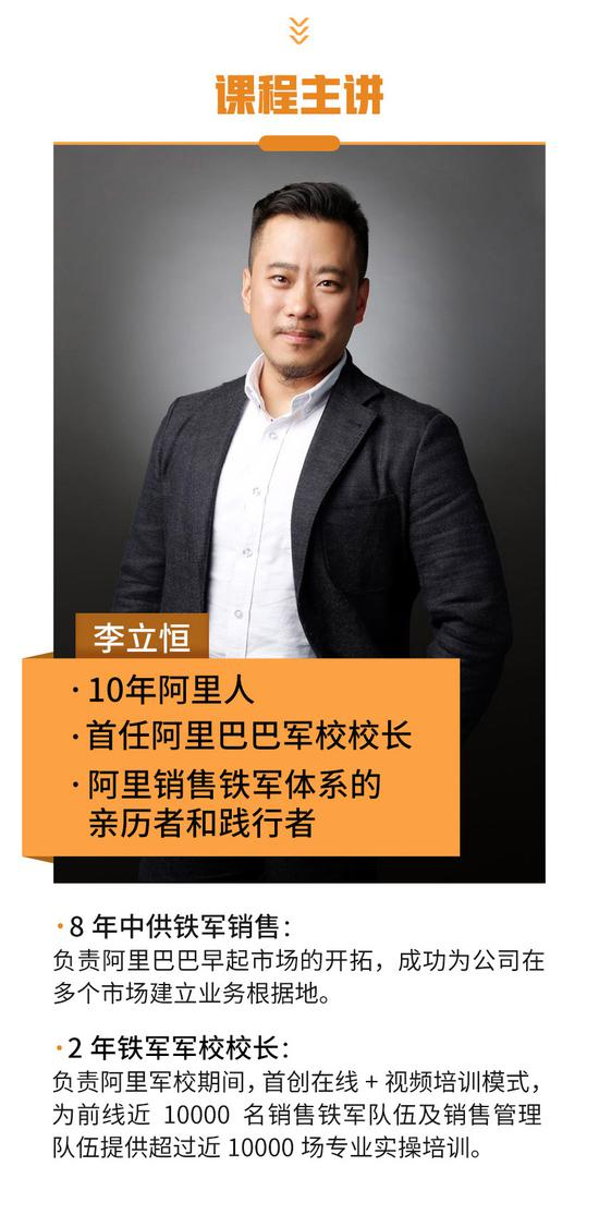 10年阿里人,首任阿里巴巴军校校长,阿里销售铁军体系的亲历者和践行者。拥有8年中供铁军销售经验,负责阿里巴巴早期市场的开拓,成功为公司在多个市场建立业务根据地;担任阿里军校校长,首创在线+视频培训模式,2年内为前线近10000名销售铁军队伍及销售管理团队提供超过10000场专业实操培训。