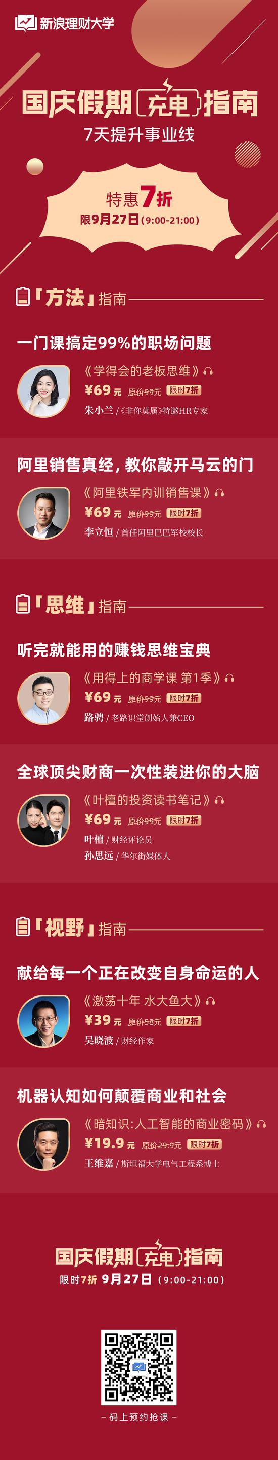 喜迎国庆,共为祖国70周年庆生!新浪理财大学特推出国庆假期充电指南特惠课程,9月27日当天限时7折,欢迎抢购!