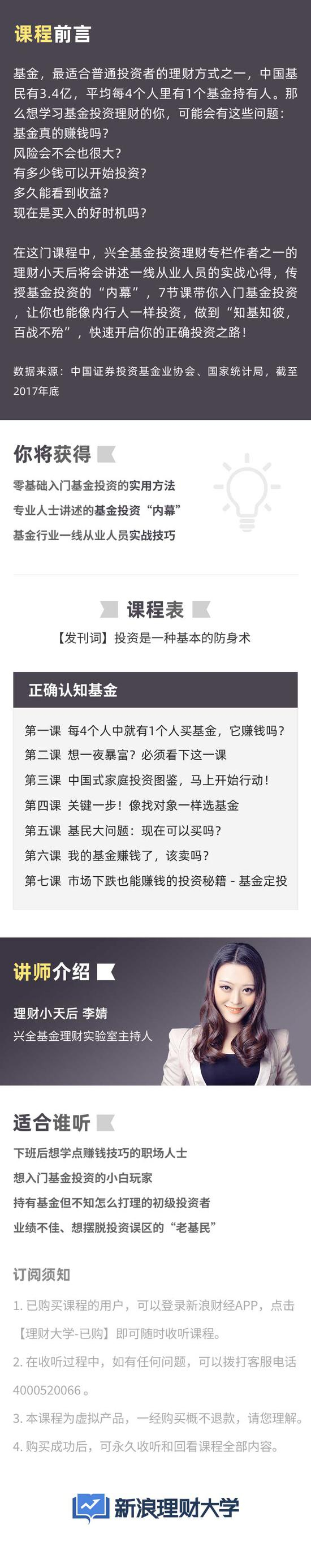 新浪理财大学音频课《这样做,迈出投资第一步》,兴全基金实验室主持人李婧老师将会讲述一线从业人员的实战心得,传授基金投资的“内幕”,一一给你答案。7节课带你入门基金投资,让你也能像内行人一样投资,做到“知基知彼,百战不殆”,快速开启你的正确投资之路!
