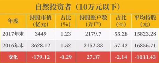 同样,从更详尽的上交所数据也能看到类似情况:资金10万元以下的个人投资者在2017年中占比也在下降,而且持股市场绝对值以及占比也在同步下降中,据简单测算,这些投资者占比下降了2%,单个账户平均持股市值下降了1000元。而且从2015年至2017年间,个人投资者市场交易净值持续为负,资金处于净流出状态。