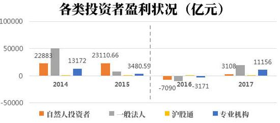 还是以上交所披露的近几年投资者盈利情况来看,市场上各类投资者赚钱规模在2015年之后颠倒了一下。以占了市场99%数量的股民为例,在2014年和2015年赚得盆满钵满,但之后呢,比起专业机构来,不但亏得更多了,赚的时候却更少了。相反,占比仅有0.12%专业机构在2017年赚了股民3倍多的钱,2016年亏的时候也仅有股民的一半不到。