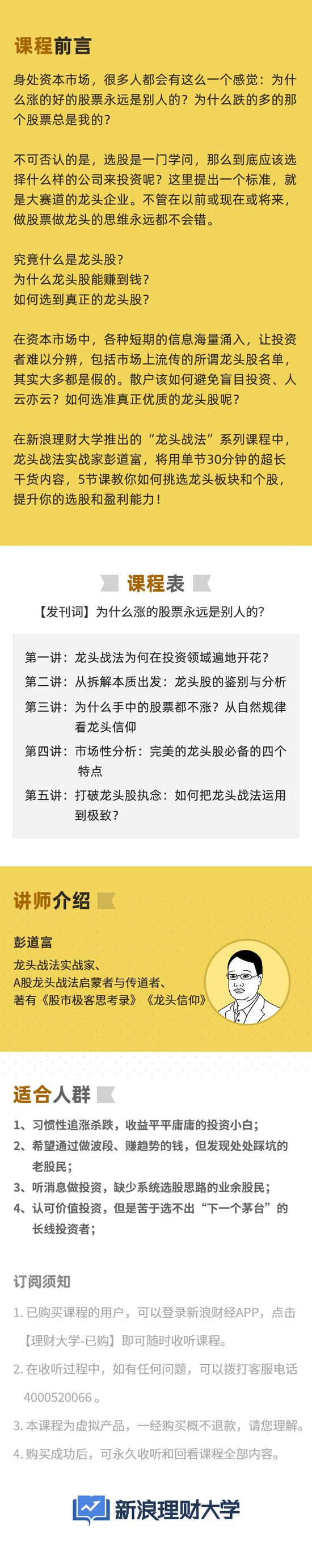 关于更多更深入的白马龙头案例和细节内容,以及作者投资十余年的心得体会,新浪理财大学特邀本文作者——彭道富老师,联合制作了系列音频课《龙头战法超长深度解析5讲》,将会为你揭秘最适合散户的股票投资战法,5节课教你如何挑选龙头板块和个股,提升你的选股和盈利能力!