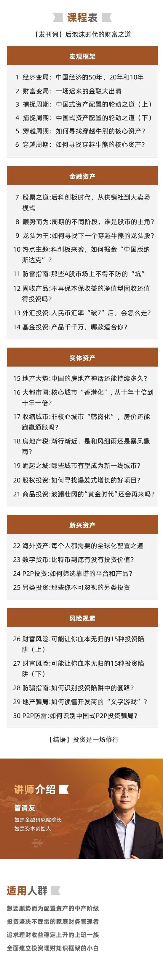 在这门课里,他将用30节课,帮更多人全面掌握投资的核心方法,穿越周期,识别“泡沫”,带你看懂中国未来10年的投资大势。