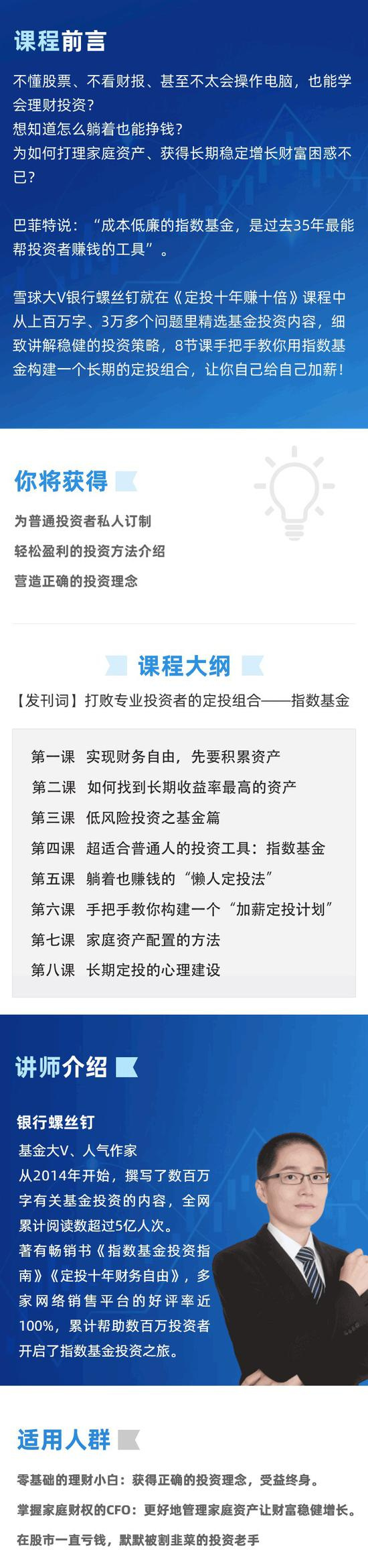 如果大家在基金定投方面还有更多想了解的问题,可以在新浪理财大学关注银行螺丝钉《定投十年财务自由》音频课!