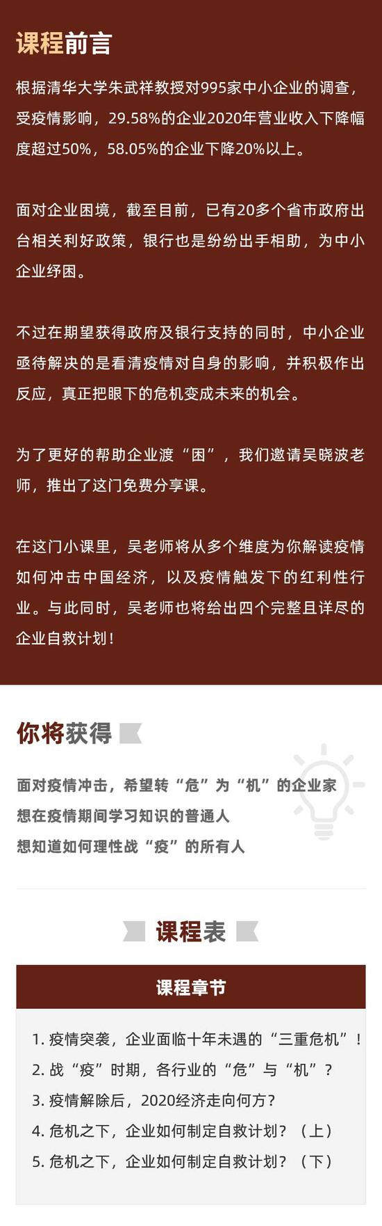 在这门小课中,吴老师将从多个维度为你解读疫情如何冲击中国经济,以及疫情出发下的红利行业,更重要的是吴老师也将带来四个完整而详尽的企业自救计划!扫描下方二维码立即收听!