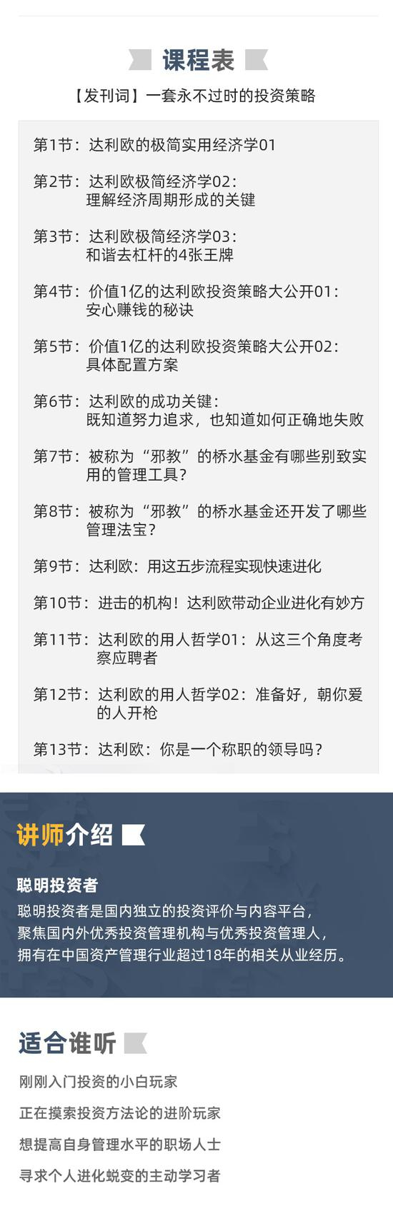 新浪理财大学《全面解析桥水达利欧的独门秘诀》将给大家系统介绍这套价值1亿的全天候投资策略,以及这套策略背后的桥水公司的进化、管理和用人之道。