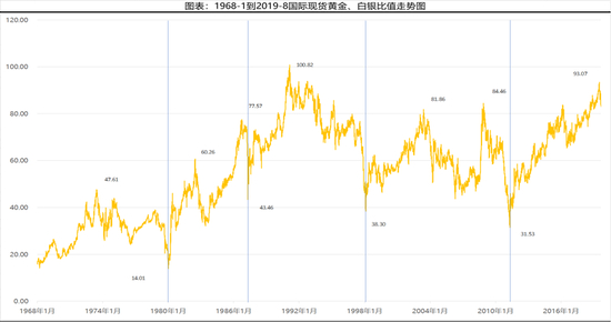 牙买加货币体系的成立导致黄金不再被用作本位货币,黄金的价格从之前的官方定价逐渐转变到市场定价。当黄金和白银的价格全部由市场交易的力量决定后,两者的兑换比例,就是俗称的金银比,也就处于相当不确定的状态。 原来金银比是固定的,后来是浮动的,不固定了。