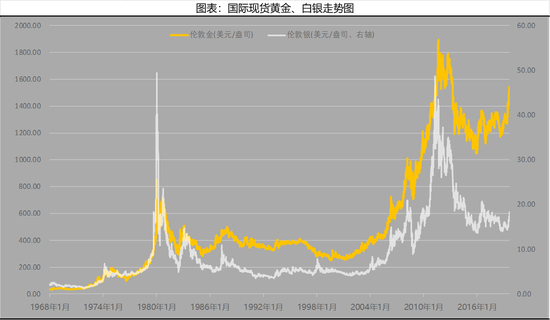 您要是懒得拉下去看图,光听我描述也行啊,下面是1968年到2019年8月伦敦金和伦敦银的价格走势图。两者相关度非常高,通过计算,他俩相关度超过0.9,波动率也极为相似。但是有意外的时候,单纯从图上看,都不用看具体数,有2个价格最高峰,第一个价格的高峰,白银和黄金同时起飞,可白银比黄金飞的高出数倍。第二个价格高峰处,白银比黄金见顶早。出现这些现象,原因是:1.白银比黄金便宜,2.白银货币属性低,3.白银市场体量小,所以容易遭到市场冲击,短期内波动剧烈。也是为什么有很多资金量大短线投资者更倾向于白银的原因。