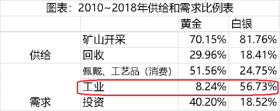 根据世界黄金协会和白银协会的数据,白银和黄金的供给来源一样,也是矿山开采和回收利用。需求都是来自消费、投资、工业生产应用。我们来看下表中的数据,特别圈出,需求方面,白银的工业需求达56.73%,远超黄金的8.24%。这就是大家为何常提到“白银工业属性更强”。投资需求呢?黄金的投资需求是白银投资需求的2倍,这说明了白银的货币属性远低于黄金。这也是造成他们短期价格走势不完全一致的原因。