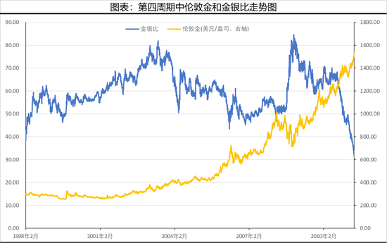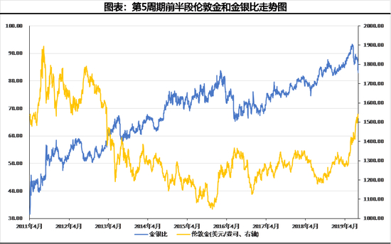 比如第四个周期,前半段,黄金价格是不温不火,金银比也缓慢攀升,直到后半段,金价大幅上涨,白银比黄金波动大,所以金银比下降了。(见下图)
