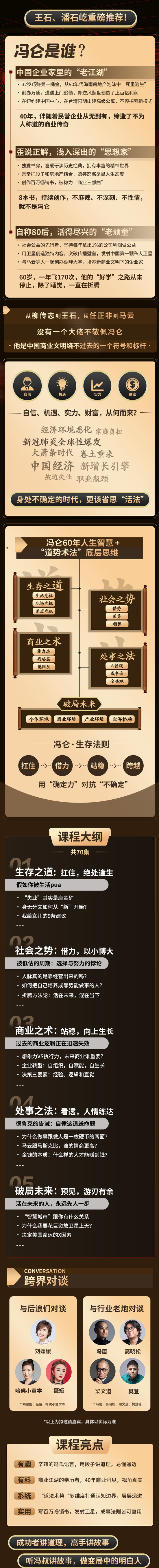 这次,冯仑从生存、社会、商业、处事4个角度总结一套《不确定时代的生存法则》,用70节课带你抓住财富的底层逻辑,最后在不可确定的未来站稳脚跟!