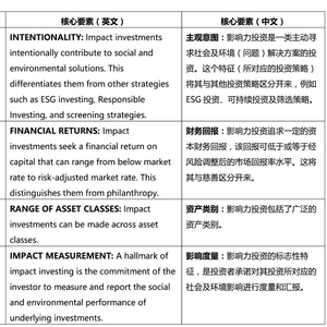 根据GIIN于2019年4月3日发表的报告《影响力投资核心特征》[1],影响力投资是旨在产生积极且可度量的社会与环境影响力,并同时带来财务回报的投资。具体来说,影响力投资包含四大核心要素(结合实践情况,在原文基础上有调整,英文原文及译文请见下表):