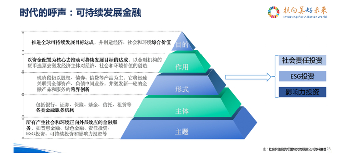 所以,可持续发展金融就是我们完成这个资金缺口、解决这个可持续发展问题的一个重要的途径。可持续发展金融现在有目标、目的,有资金配置为核心推动目标的达成。我们现在仍然是以股权、债券、信贷为主,很快就会关联到全部资产、负债和中间业务,而且要激发新一轮的金融产品创新和跨界的创新。主体包括银行、证券、保险、基金、信托,各种各样的金融服务机构。所有产生社会环境、正向外部效应的金融服务,包括普惠金融、绿色金融、责任投资、ESG投资、可持续投资和影响力投资等(都属于可持续发展金融)。