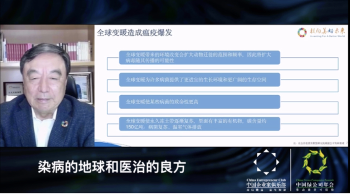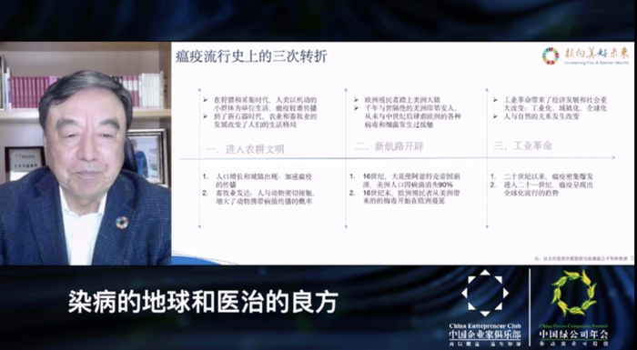 第一,瘟疫与人类社会发展的关系。第二,为什么这些年瘟疫发生的频率越来越高,这背后是什么原因?我们也发现了气候变化(问题),发现地球病了,人类为了救治这个地球做了不少努力,现在我们才找到了一个医治地球的最佳良方,这就是可持续发展的理念。所以,最后,我要倡导我们要坚持可持续发展,这也是一种新的商业文明。