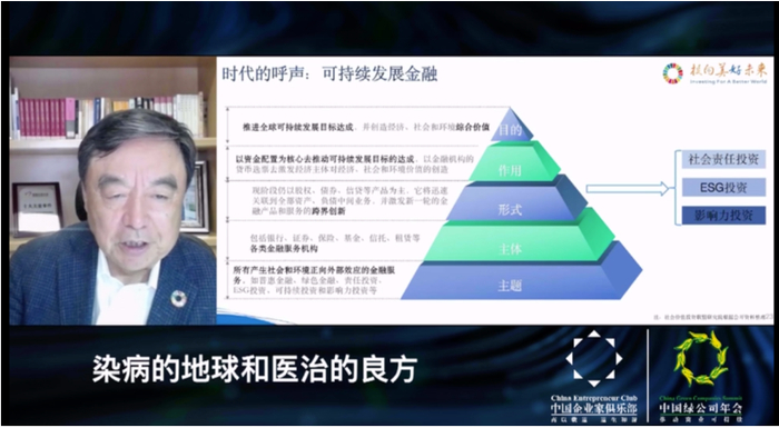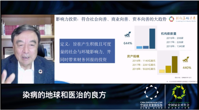 所以,比起“责任投资”、“ESG投资”,影响力投资跟可持续发展可能是最为默契的投资理念,因为它追求经济收益和社会价值与环境的一体性。也就是在每一笔投资、每一个经济活动发生的时候,既考虑它的经济回报,同时考虑它对社会、对环境正面的影响的价值。所以,这比我们出了问题再去解决,出了污染再去整治,出现贫富差距再去扶贫,出现疫情再来捐款,比这些要主动、要本源。所以,我觉得影响力投资以及可持续发展这些投资理念,应该是我们改变旧的传统的模式,治理地球病最好的药方,这就是可持续发展,也包括影响力投资在内的可持续发展金融理念。