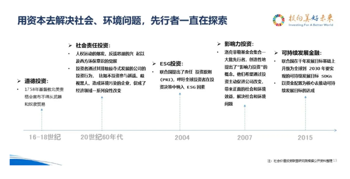 到了上世纪60年代,当时随着人权运动,南非的种族隔离,还有越战等事件爆发,在投资界、金融界就出现了“责任投资”、“底线投资”和“使命投资”的说法。投资人想通过排除掠夺式发展公司的投资行为,比如你有越战,我就不参与投资;你歧视黑人、造成污染的企业,我就不投资,这叫责任投资。还有底线投资。后来联合国在2004年提出了责任投资的升级,ESG就涉及到社会、环境、治理三个方面。