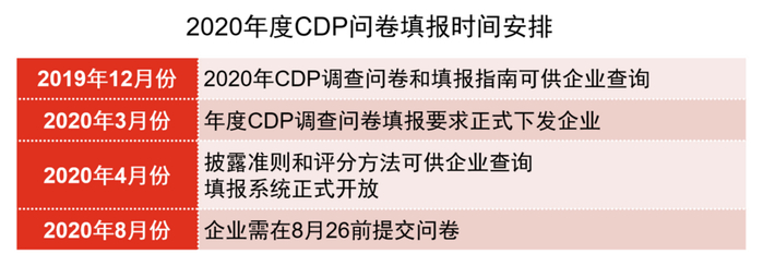 根据 CDP 公开的时间表,目前受邀企业已进入问卷填报期,企业应及时关注受邀情况及问卷发放情况,汇总信息及时填写问卷、上传支持材料。