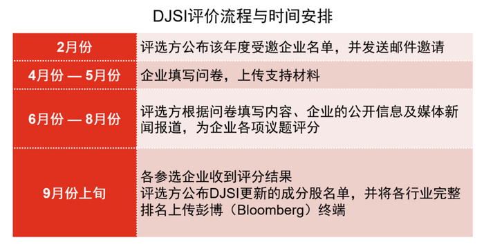 根据 DJSI 公开的时间表,目前受邀企业已进入问卷填报期,企业应及时关注受邀情况及问卷发放情况,汇总信息,及时填写问卷、上传支持性材料。