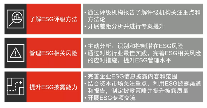 当上市公司获得更好的 ESG 评级,纳入相关指数,将更有机会受到投资机构的青睐和追逐。各种 ESG 指数的评价逻辑虽各有特色,但评级提升的道路仍然是殊途同归。为在资本市场获得更好的 ESG 评价,我们建议企业考虑在以下方面开展工作: