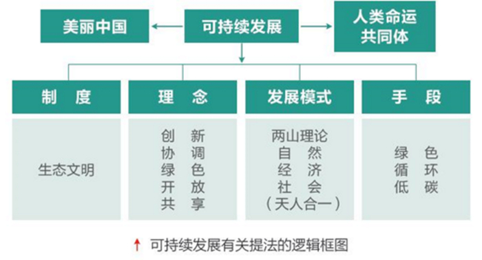 从图中可以理解:可持续发展是人类社会共同追求的理想和目标,生态文明是制度性跨越,新发展理念是落实生态文明建设的科学指导,绿色循环低碳是实现可持续发展目标的手段,“两山理论”与实践是发展模式,美丽中国是中国面向“两个一百年”奋斗目标的努力方向,人类命运共同体是对世界的责任和担当。