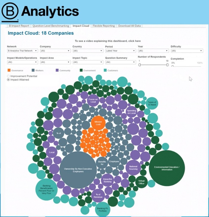 B Analytics是由共益实验室(B LAB)开发的一个用于帮助企业跟踪,基准参照和提升影响力的平台。该平台使用“ B Impact Assessment”(BIA)和“ SDG Action Manager”从全球70,000家公司中收集的数据,形成了全球最大的私营企业社会和环境绩效数据库,帮助企业网络、投资者和大公司分析目标企业的环境和社会影响。