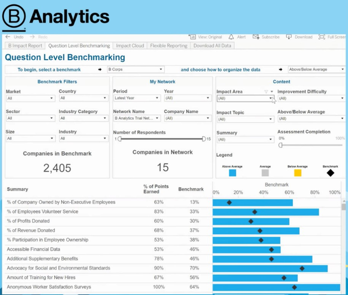 在B Analytics平台上,使用者可以了解特定一家企业的基于基准的表现,也可以了解一组企业相对于其他企业的表现,可以进行比较的企业类目有企业类型(如所有企业或仅共益企业)、企业规模、所属行业和所在国家等。在衡量方面,不论是象征总体影响力表现的共益影响力评分(B impact score),还是诸如员工领取高于最低工资标准薪资的比例等单个指标,用户都可以在平台上清楚的了解。