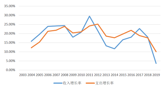 图2 2003-2019年我国基本养老保险基金收入与支出情况