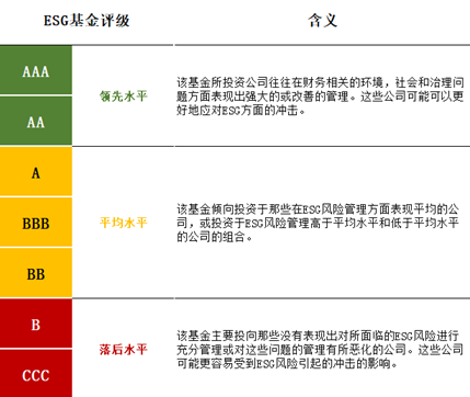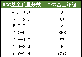 MSCI对ESG基金的评级在整体架构上同对ESG整体的要求类似,旨在评估基金总持有量对长期ESG风险和机会的弹性。覆盖范围内的每只基金都将获得一个像MSCI ESG评分(0-10分)一样的整体“ESG基金质量分数”(0-10分),其汇总了各个公司的ESG得分,以便根据基金的基本持有量为投资者提供ESG基金总体评分上的指示。ESG基金评级(AAA - CCC)是将“ESG基金质量分数”直接映射到字母评级类别中得到的,各级别的评级所代表的含义如图所示。