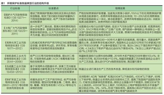 “波特假说”认为,环境规制一方面增加了企业的治污成本,另一方面可能激发企业的技术创新动力。研究表明,环境规制对工业化中期和后期阶段城市的产业结构升级具有显著的促进效应,且对中期阶段城市的促进作用更强[4],对我国现阶段经济结构的调整升级应具有正向促进作用。行业污染物排放标准是引领和推动绿色发展的重要环境管理手段。行业污染物排放标准一方面对新发展工业项目起到引导和限制作用,有利于从源头把好环境准入关;另一方面能引导和倒逼现有工业企业优胜劣汰,推动淘汰高耗低效的落后和过剩产能,促进工业企业开展技术创新活动、升级生产工艺、加快产品更新,降低能耗、物耗和污染物排放强度,推动工业结构优化升级(见表1)。