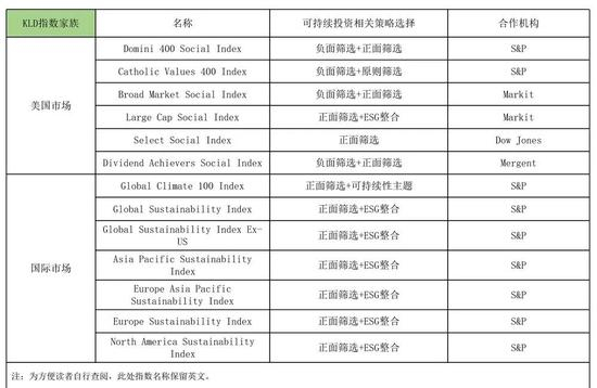评级流程的完善使KLD开发新指数产品变得轻松,截至2009年其被Risk Metrics Group收购前,KLD共发布了13只指数:美国市场6只,国际市场7只,其中不乏与标普、道琼斯等大型指数机构的合作产品。