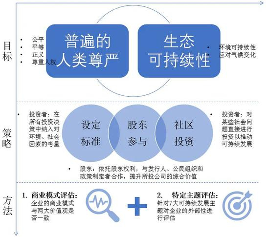 此后,转型为主动管理型影响力投资基金的多米尼投资开始构建影响力投资的标准体系。该体系分为三个层面:目标层,追求生态可持续性(E)和维护人类普遍尊严(S);策略层,设定投资标准以影响市场,行使股东权利以监督企业,开展社区投资以造福社会;方法层,商业模式评估和特定主题评估相结合。
