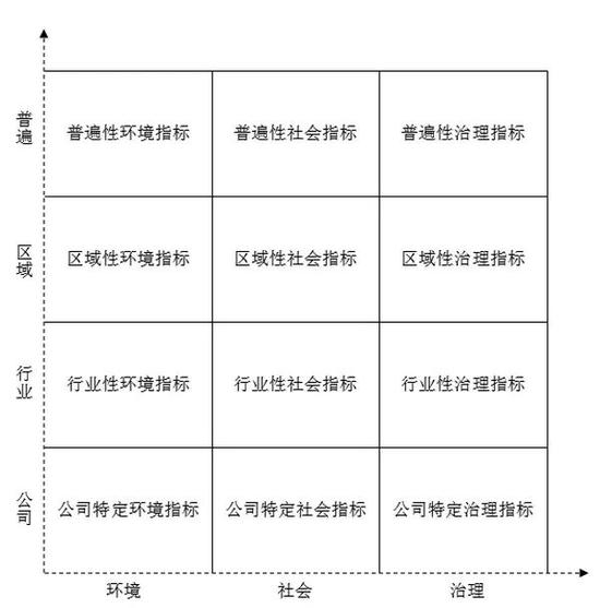 在指标维度上,2006年后KLD将自己的指标体系更新为ESG框架。也是在2006年,联合国支持的责任投资原则组织发布了责任投资原则(PRI),ESG因素由此开始被广泛研究和运用。紧接着,为了适应国际不同市场的异质性,KLD搭建了更为合理的框架,从覆盖范围上将指标分为四类:普遍(国际)性指标、区域(国别)性指标、行业(同类)指标和公司特定指标。由此,我们可以归纳出一个评级矩阵图。