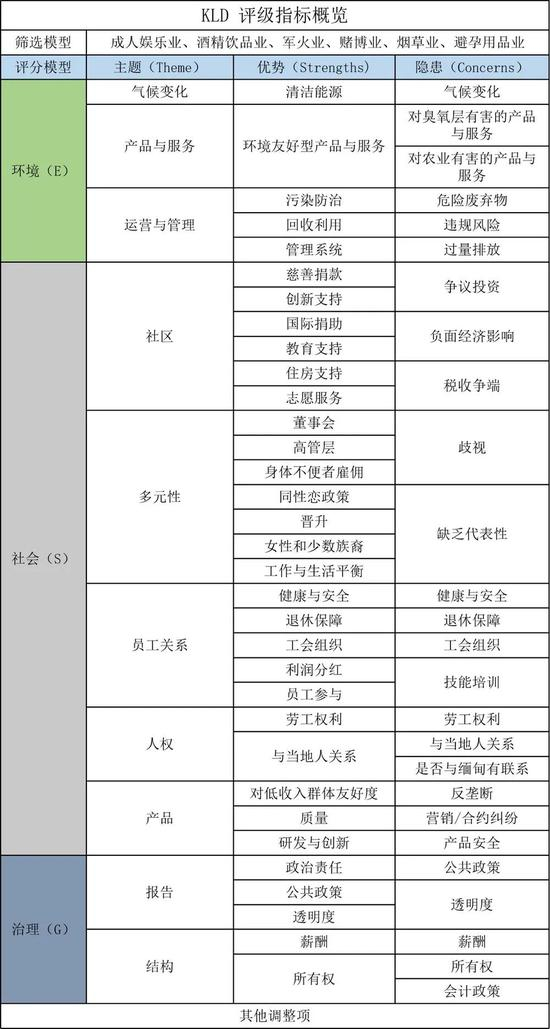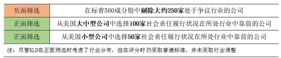 如上图所示,KLD评估体系中的很多指标至今仍出现在国际主流ESG评级机构的指标体系中,不过前者最大的特点是保留了社会责任投资的筛选策略,其筛选模型是对特定行业或有争议事项的企业直接进行剔除,而不是在对所有企业进行社会责任评分后进行淘汰。