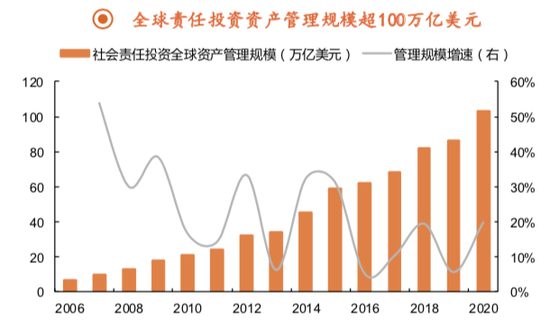 据联合国责任投资原则组织的统计,目前全球责任投资资产管理规模由2006年的不足7万亿美元增至目前超100万亿美元,UN PRI的签署机构已超3000家。