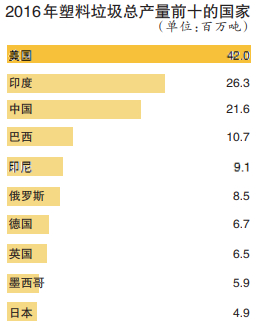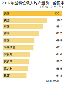 今年10月,美国环保署(EPA)发布了一项解决海洋垃圾问题的计划,点名指出五个亚洲国家——中国、印度尼西亚、菲律宾、泰国和越南,要为每年流入海洋的塑料垃圾负主要责任。然而据美国《国家地理》杂志报道,科学家们对这种说法并不认可。近日发布于国际学术期刊《科学进展》的一项最新研究指出,美国把塑料垃圾污染问题归咎于亚洲国家,但美国才是世界上最大的塑料垃圾制造者。美国2016年制造的塑料垃圾量在全世界排名第一,达4200万吨;年度人均制造塑料垃圾130.1公斤。美国虽然只有世界总人口的4%,却制造了世界上17%的塑料垃圾。