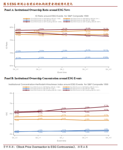 由于机构投资者在投资决策过程中更加注重ESG问题,为了检验投资者是否因为对此问题过度关注而忽略了基本面方面的信息,文章进一步研究了ESG新闻公告前两个季度到ESG新闻公告后两个季度之间机构投资者持股情况的变化。图5的Panel A展示了机构投资者持有的自由流通股比例(Institutional Ownership Ratio)的变化情况,Panel B展示了以HHI指数(Herfindahl-Hirschman index)度量的持股集中度(Institutional Ownership Concentration)的变化。可以发现:相比正面的ESG新闻,负面的ESG新闻公告后,机构持股比例有所减小,即机构投资者卖出所持股票,并且持股集中度会增加。同时与前文结论一致,小市值的股票持股变化较为明显。对于小市值股票,平均机构持股比例从负面ESG新闻发布前一个季度末的77.76%到后一个季度末的76.91%,而正面ESG新闻发布后的变化是从78.95%增加到79.19%,这个变化的差异很小,并且没有统计学意义。这个结果可能归因于对于S&P500指数成分股这样大市值的股票来说,投资者更看重跟踪误差风险,在面对ESG负面新闻的冲击时,相比小市值股票,可能仍是不太愿意出售大市值股票。