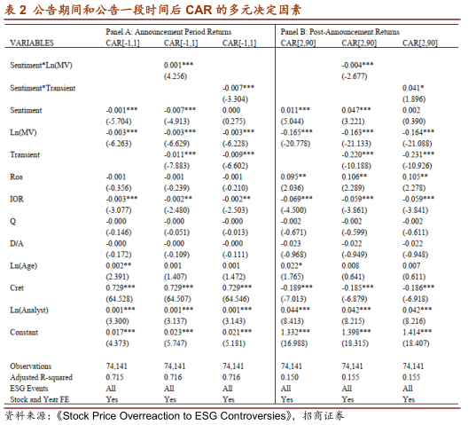 Panel A展示了公告期间CAR的多元回归结果,CAR[-1,1]表示公告前1天到公告后1天的CAR值。研究发现:Sentiment变量的系数均显著为负,说明负面的ESG新闻公告比正面的ESG新闻公告带来更大的负的异常收益;Sentiment*Ln(MV)变量的系数显著为正,表明负面的ESG新闻发布时,规模较小的公司产生更大的负的异常收益;Sentiment*Transient变量的系数显著为负,表明负面的ESG新闻公告对机构持股比例较高的股票冲击更大。