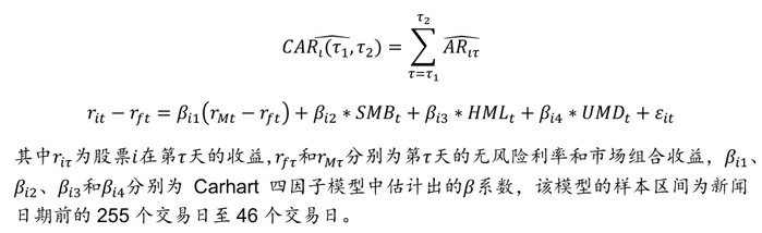 文章使用事件分析法对比ESG新闻公告前后的股票收益,通过计算每条新闻发布后21个交易日内的累计异常收益率(CAR)进行分析。计算公式如下: