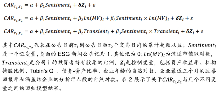 上述结果检验了负面ESG新闻公告和CAR之间的单变量关系。然而,在负面的ESG新闻公告前后,可能还有其他与股票回报相关的公司特征。因此,文章进一步通过多元分析对ESG新闻公告一段时间后的CAR的相关因素进行研究,同时验证股价对负面的ESG新闻反应过度是否在小市值股票和机构投资者持股比例高的股票中更为明显。文章使用的回归模型如下: