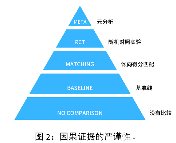 以生产药物的公司而言,药物产品与治愈疗效之间的因果关系,常通过某种比较来证明。下图由严谨度最低的方法依序而上,最低是”没有比较”,在不做任何比较的情况下,仅从正面效果本身来理解干预的效果。较好的是与”基准线”对照,把实验组的结果与类似组的先前结果相比。更好的是”倾向得分比配”,把接受实验者与未接受实验者的情况相比。再上一级的是”随机对照实验”,依随机取样法找出实验组与对照组,将两组结果进行比较。最好的是”元分析法”,针对多项随机对照实验的结果进行全面性分析。