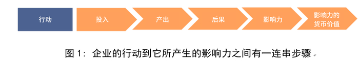 影响力的评估涉及因果的关联,但这种关联通常不能直接得知。在此,我们真正想评估的是ESG影响力,但从企业的行动到影响力,其间有一连串步骤,包括行动(activity)、投入(input)、产出(output)、后果(outcome),最后才是影响力(impact),如下图所示。