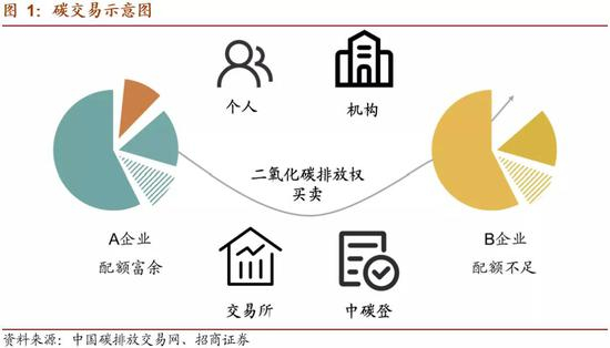 碳交易市场是由政府通过对能耗企业的控制排放而人为制造的市场。通常情况下,政府确定一个碳排放总额,并根据一定规则将碳排放配额分配至企业。如果未来企业排放高于配额,需要到市场上购买配额。与此同时,部分企业通过采用节能减排技术,最终碳排放低于其获得的配额,则可以通过碳交易市场出售多余配额。双方一般通过碳排放交易所进行交易。