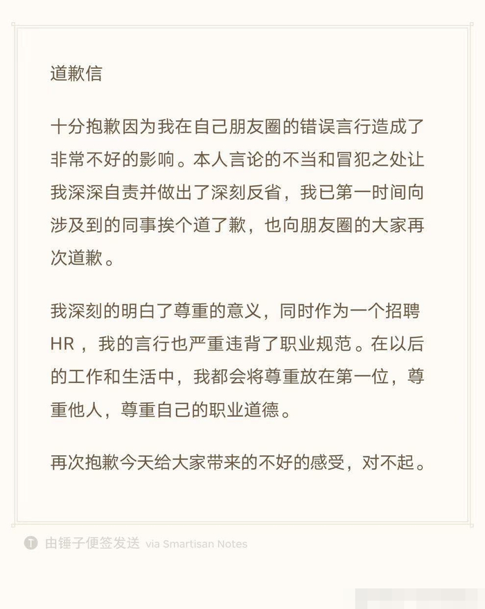 澎湃新闻记者注意到,随后网上开始流传一份疑似当事人徐某的道歉信。徐某在道歉信中表示,“十分抱歉因为我在自己朋友圈的错误言行造成了非常不好的影响……自己已经深刻反省并第一时间向涉及到的同事道歉。”同时,他还称作为HR,自己的言行违背了职业规范,以后会将尊重放在第一位。