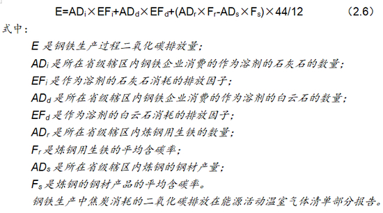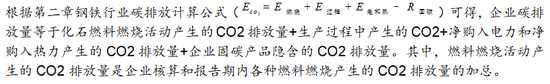 2) 《中国钢铁生产企业温室气体排放核算方法与报告指南(试行)》(以下简称“钢铁生产企业指南”)为钢铁生产企业试行指南,目前国家并未对钢铁生产企业温室气体排放核算与报告下发正式文件。根据钢铁生产企业指南,钢铁生产企业二氧化碳排放量为燃料燃烧排放+工业生产过程排放+净购入使用的电力、热力产生的排放-固碳产品隐含排放,其计算公式为: